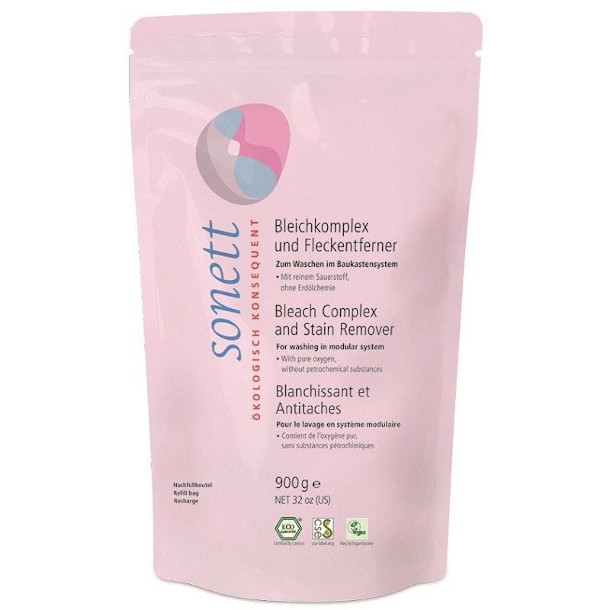 MODUŁ 3 W SYSTEMIE MODUŁOWYM SONETT Skład: 100% nadwęglan sodowy – wzbogacona tlenem soda. Ponieważ wybielacz Sonett nie zawiera petrochemicznych aktywatorów wybielających, jest on efektywny przy praniu w pralce dopiero od 50ºC. Jeżeli jednak poddamy pranie działaniu wybielacza przez dłuższy czas, np. poprzez namoczenie przez noc, wówczas działa on już od 30ºC. Dozowanie: w pralce: na 4,5 kg prania dodać 2-3 łyżki stołowe (około 50 ml) wybielacza do szufladki z odpowiednią iloścą proszku lub płynu Sonett – do prania głównego. Namaczanie: rozpuścić 25 ml wybielacza Sonett w około 3 litrach ciepłej wody, włożyć pranie, dociążyć np. talerzem, aby prane tkaniny pozostawały cały czas w roztworze wybielającym. Pozostawić na noc. Następnie wyprać w zwykłej ilości proszku lub płynu Sonett. Zastosowanie: 1. Do wszystkich tkanin białych oraz kolorowych o trwałych barwach z bawełny, lnu, konopi i mieszanych. 2. Do usuwania wszystkich dających się utlenić plam, takich jak plamy po owocach, czerwonym winie, herbacie, kawie, trawie, krwi itp. 3. Regularne użycie zapobiega szarzeniu tkanin. 4. Do rozjaśniania tkanin pożółkłych i poszarzałych. Produkt nie zawiera: • surowców petrochemicznych • syntetycznych środków zapachowych • syntetycznych barwników • syntetycznych konserwantów • surowców modyfikowanych genetycznie • enzymów • składników alergizujących • fosforanów • wybielaczy optycznych • zwierzęcych tłuszczy i innych surowców z martwych zwierząt