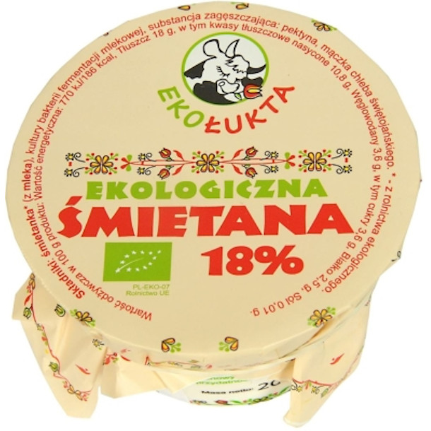 SKŁAD: śmietanka* (z mleka), czyste kultury bakterii, substancja zagęszczająca: pektyna, mączka chleba świętojańskiego (*certyfikowany składnik ekologiczny)