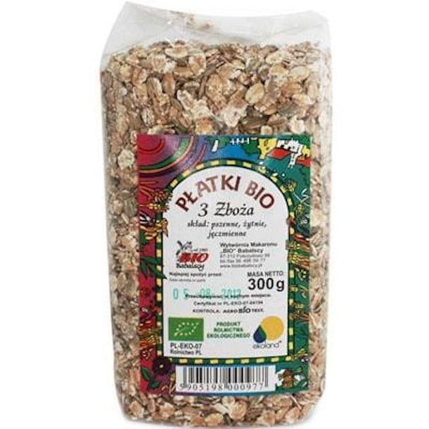 Skład: płatki pszenne bio, płatki żytnie bio, płatki jęczmienne bio.
