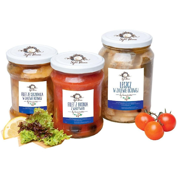 Skład: ryba – filety z okonia, woda, ocet spirytusowy do 3%, cytryna, papryka słodka, pieprz zielony, gorczyca, koper, cukier, sól, mąka pszenna.