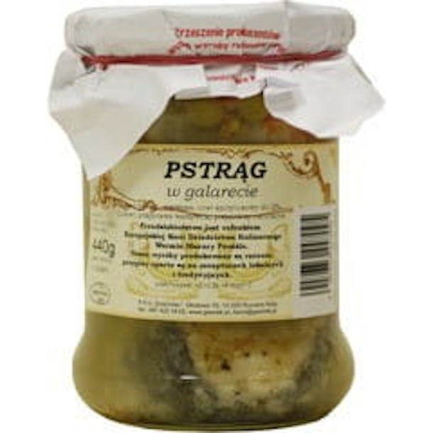 Skład: pstrąg smażony na oleju jadalnym, zalewa octowa : woda, ocet spirytusowy do 3%, cukier, sól, przyprawa warzywna : marchew, cebula, pietruszka nać, pasternak, kurkuma, pieprz czarny, lubczyk nać, curry – zawiera gorczycę, żelatyna wieprzowa, mąka pszenna, przyprawy naturalne.