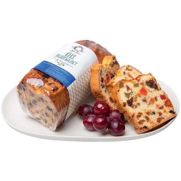 Skład: mąka pszenna, masło extra, masło roślinne, jaja, cukier puder, rodzynki, ananas suszony, figi suszone, daktyle suszone, morele suszone, śliwki suszone, orzechy włoskie, aromat rumowy, proszek do pieczenia.