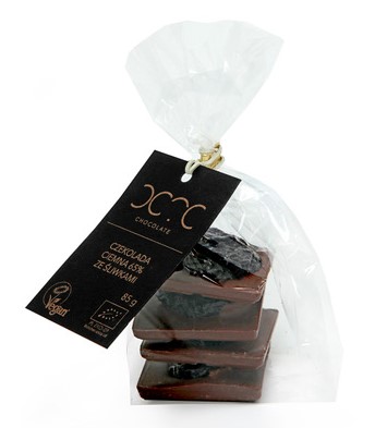 SKŁAD: śliwki kalifornijskie* 35%, nieprażone ziarno kakaowca*, cukier z kwiatu palmy kokosowej*, tłuszcz kakaowy* – zawartość masy kakaowej min. 65% (* certyfikowane składniki ekologiczne)