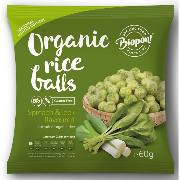 Skład: ryż*, olej słonecznikowy*, szpinak* (1,8%), por* (1,5%), sól morska, cebula*, pieprz* (*certyfikowany składnik ekologiczny)