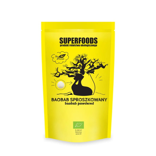 Skład: baobab sproszkowany bio 100%. Sproszkowany baobab powstaje ze zmielonego miąższu owoców baobabu. Od setek lat stanowi ważny element diety w krajach Afryki. Charakteryzuje się kwaśnym, lekko cierpkim smakiem. Stanowi doskonałe źródło błonnika pokarmowego. Polecamy jako dodatek do koktajli, soków, sałatek, jogurtów i deserów. Zalecamy spożywać nie więcej niż 4 łyżeczki dziennie i zachować ostrożność w podawaniu dzieciom. Podczas spożywania produktu zalecane jest picie dużej ilości płynów.